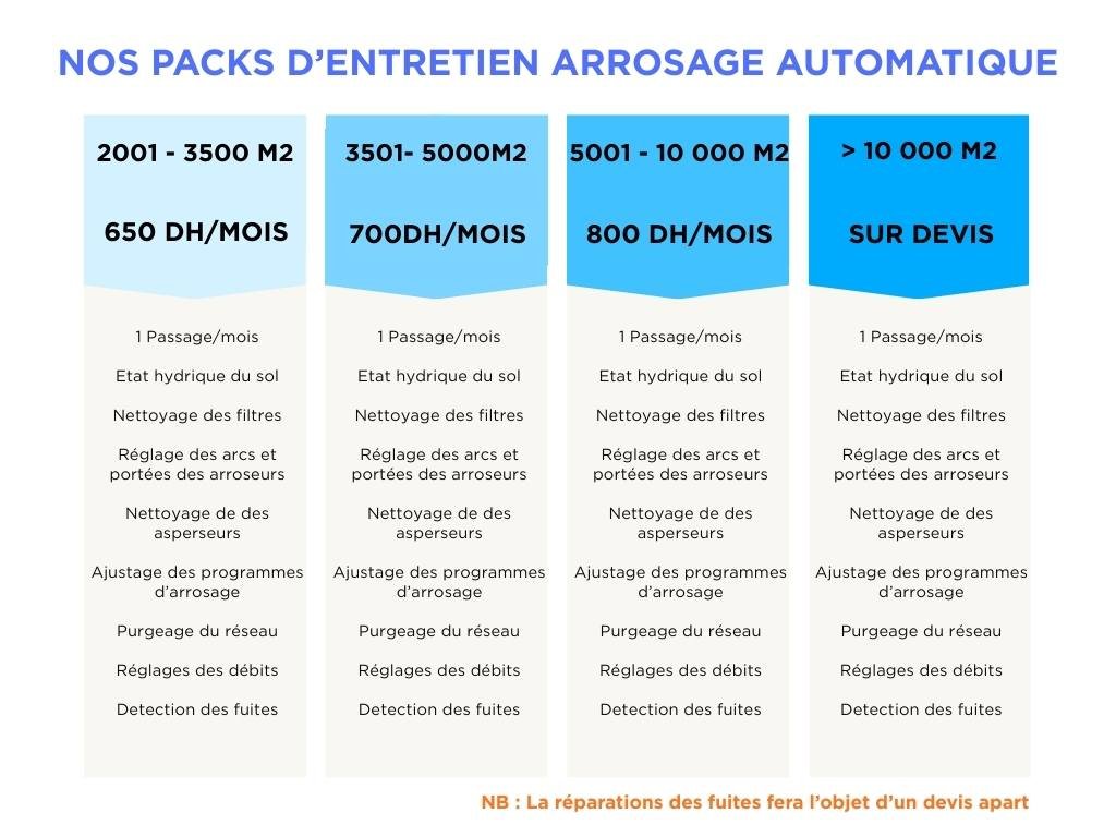 Idéalement, un entretien mensuel permet de détecter rapidement toute anomalie ou tout dysfonctionnement. Il garantit le bon fonctionnement du système tout en générant des économies significatives d’eau. Nous recommandons un niveau d’entretien minimal, adapté au type de jardin, comme suit :